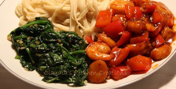 Ik serveerde het met roergebakken spinazie met knoflook en mie. De waterkastanjes zijn heel lekker, lekker knapperig. Het was erg lekker en niet moeilijk.